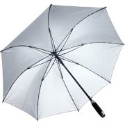 Deluxe Paraguas de Golf con 8 cascos de tela 190T PONGEE reverso cobertura plateada con protección UV. Cuerpo y varas reforzadas de Fibra de Vidrio, sistema de apertura automático. Mango recto de EVA negro y aluminio anodizado. Incluye funda al tono de 190T PONGEE.