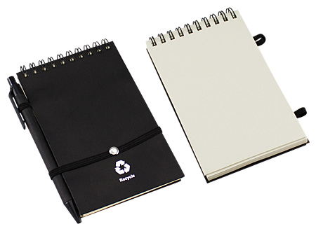 Libreta Ecológica con tapas de cartón reciclado, 70 hojas interiores blancas (croqueras). Incluye cierre elásticado de color y bolígrafo ecológico al tono.