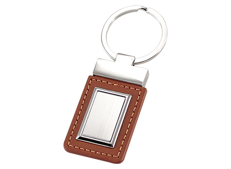 Llavero de Cuero Café con ventana rectangular metálica. Presentación en estuche laminado café con cuna aterciopelada.