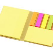 Memo Set con Tapas Duras enchapadas en madera de Bamboo. Incluye 50 post-it amarillos grandes, 25 post-it amarillos medianos y 125 banderitas adhesivas de colores.