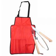 Delantal de tela polyester con 3 herramientas para asado cuchillo, tenedor y pinzas. Plegable y transformable en bolso.