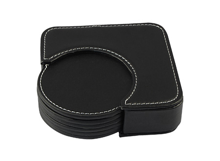 Set de 6 posavasos redondos, en PU negro. Incluye contenedor cuadrado. Infaltable en tu bar.